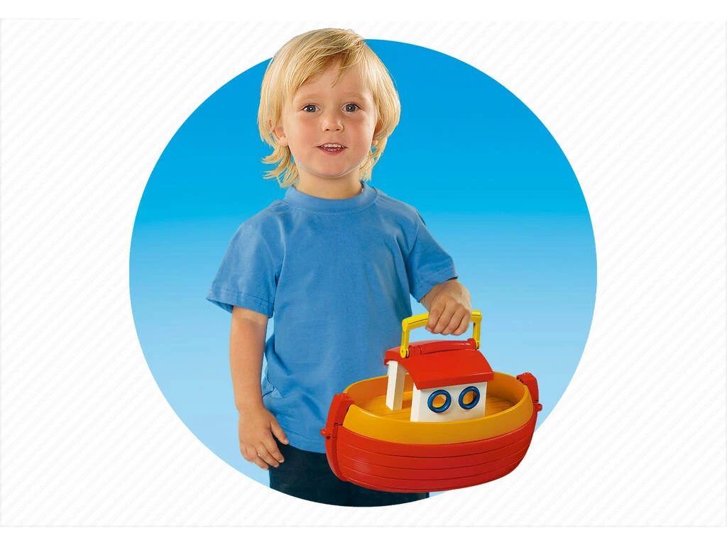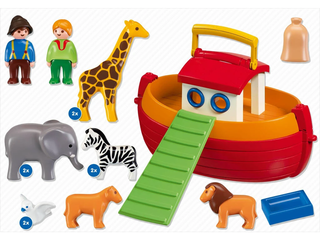 Arca de Noé con 2 figuras, 2 elefantes, 2 palomas y una gran variedad de animales. El barco flota en el agua y dispone de rampa de acceso. El arca es maletín y puedes guardar todos las figuras y animales.