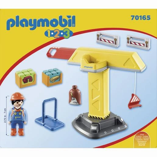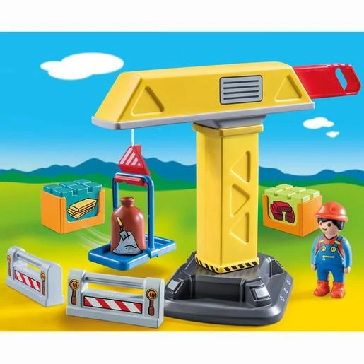 ¡Atención estamos de obras! Ayuda al conductor de la grúa a cargar los materiales de construcción. Con brazo giratorio y plataforma elevadora. Dimensiones: 22 x 21 x 12 cm (LxPxA)