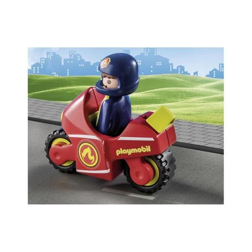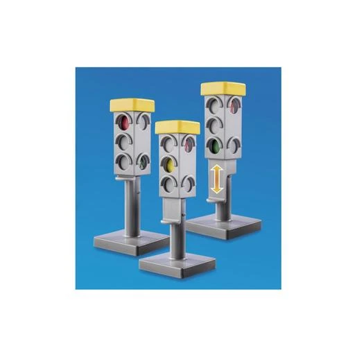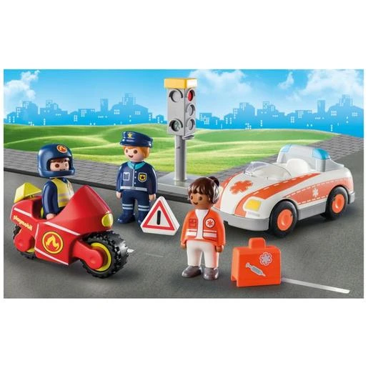 Este set contiene tres figuras Playmobil 1.2.3, una motocicleta, un vehículo de médico, un semáforo, un triángulo de advertencia y muchos otros extras. El semáforo puede colocarse en tres posiciones diferentes gracias a un deslizador lateral.