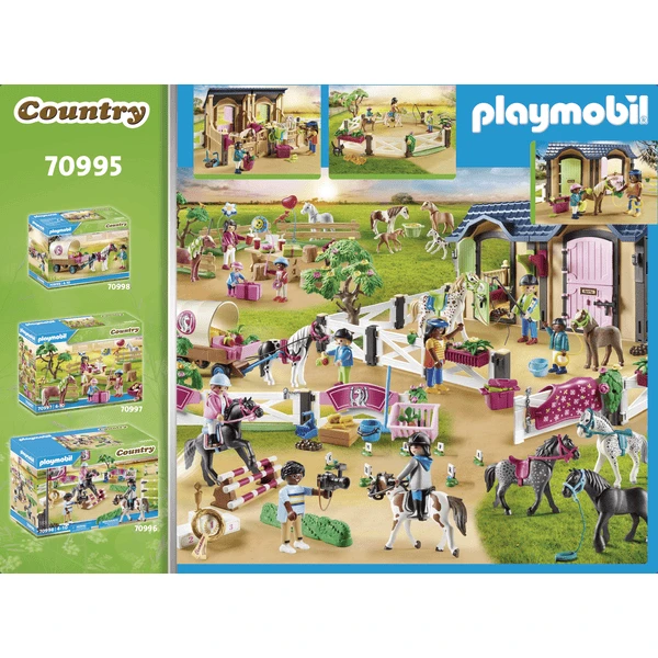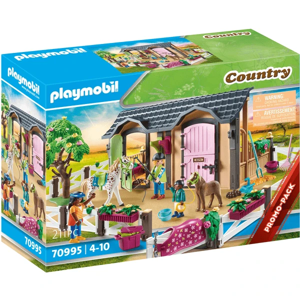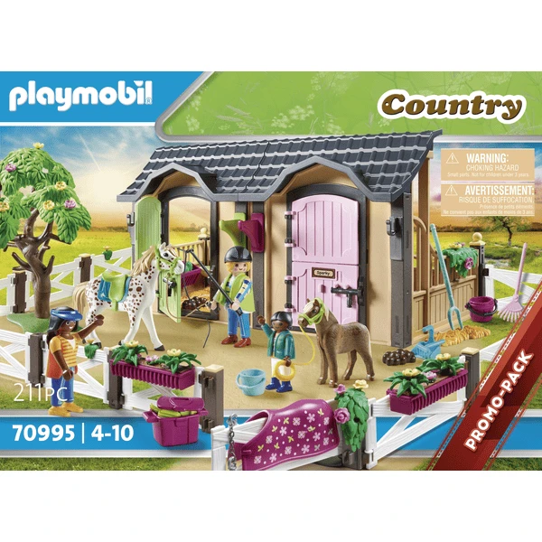 - Accesorios: 1 establo, 1 árbol, 2 almohadillas de heno, 1 silla de montar. 1 manta para la silla de montar, 1 cabestro con lance, 1 fusta, casco, 1 casco para niños. 1 cabestro para ponis con cuerda, 1 horca, 1 pala, 1 rastrillo para barrer, 1 pajar, 1 cubo, 2 pilas para caballos, 1 gorra de pico, 1 manta para caballos, 1 caja de flores, 1 caja de aseo con accesorios, 3 helechos, 2 mechones de hierba, 1 mechón de forraje.