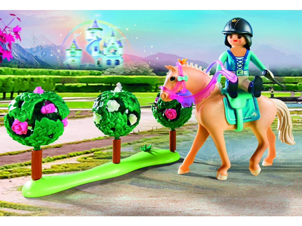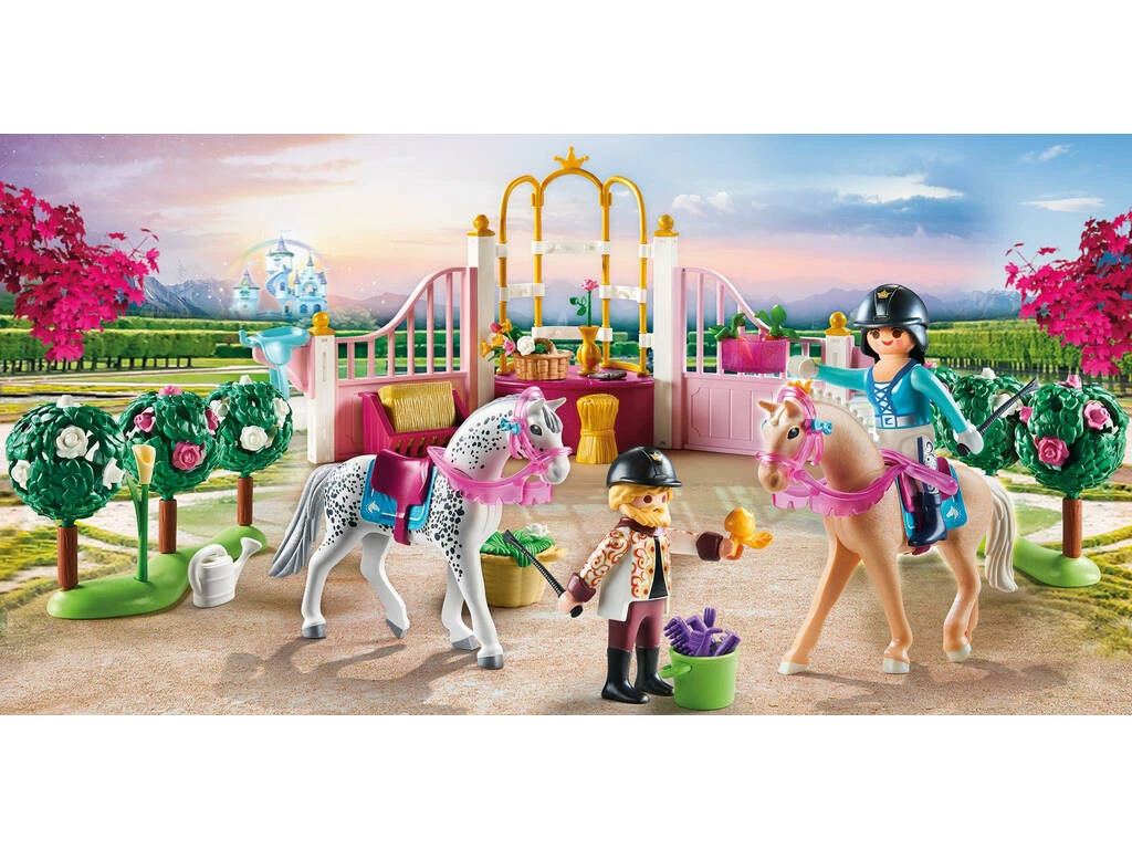 Incluye: 2 figuras Playmobil, 2 figuras de caballos, 1 playset establo de equitación, 1 regadera, 1 cesta, flores, árboles, cepillos para los caballos y muchos más accesorios de juego.