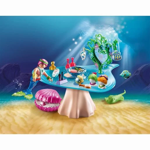 La sirena se prepara enfrente del espejo de coral en el Salón de Belleza con Joya. Con perlas, un colgante para hacerte tu propio collar (collar no incluido) y muchos accesorios. Se puede combinar con 70094 Cala de Sirenas con Cúpula Iluminada. Dimensiones: 21 x 20 x 20cm (LxPxA)