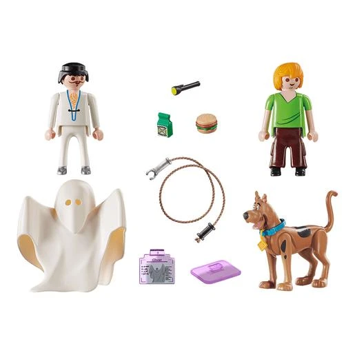 El pero y el muchacho más miedosos de toda la historia de los detectives, y, sin embargo, los más aventureros en casos fuera de lo normal. Scooby Doo llega al universo Playmobil con este set que incluye un fantasma, y que además puedes combinar con el set 70286 con la máquina del misterio.