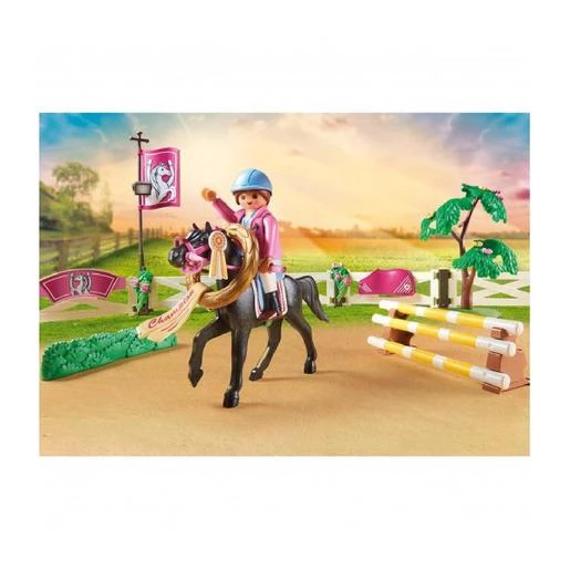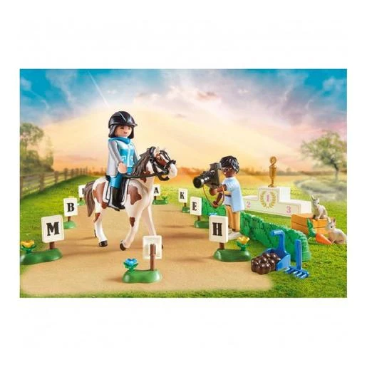 Incluye tres figuras Playmobil, dos caballos, un conejo, una zanahoria, sillas de montar, manta, elementos de valla, varios obstáculos, dos banderas de torneo, un podio de ganadores y muchos otros extras para emocionantes torneos ecuestres. Los elementos de la valla se pueden colocar libremente. Con las placas incluidas se puede configurar un curso de doma.