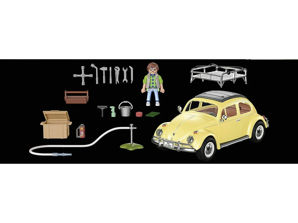 Incluye: 1 Volkswagen Beetle Edición Especial de color amarillo con guardabarros curvados, espejos retrovisores redondos y cromados, un motor bóxer de 4 cilindros bajo el capó trasero y baca con correas en el techo para el equipaje, 1 figura adulta con camiseta verde, chaleco, pantalón largo y deportivas, 1 cubo, 1 esponja, 1 manguera de agua, herramientas y muchos más accesorios de juego.